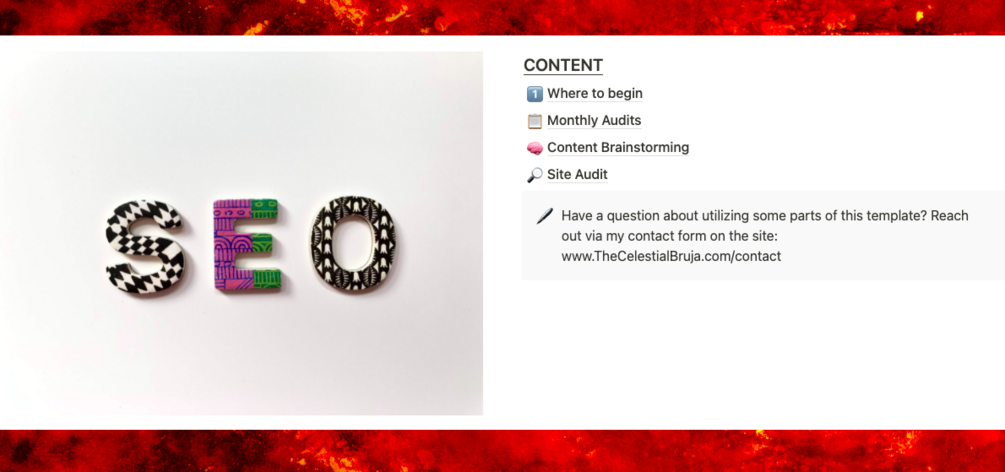 This Notion Dashboard is SEO-focused for small businesses and service providers who are looking to optimize their content. In this dash, you'll find free resources, the steps I followed in planning out how to optimize my content, instructions on how to perform a routine audit, a notebook with an audit template so you can easily plug in the info you need to focus on, and content brainstorming templates.